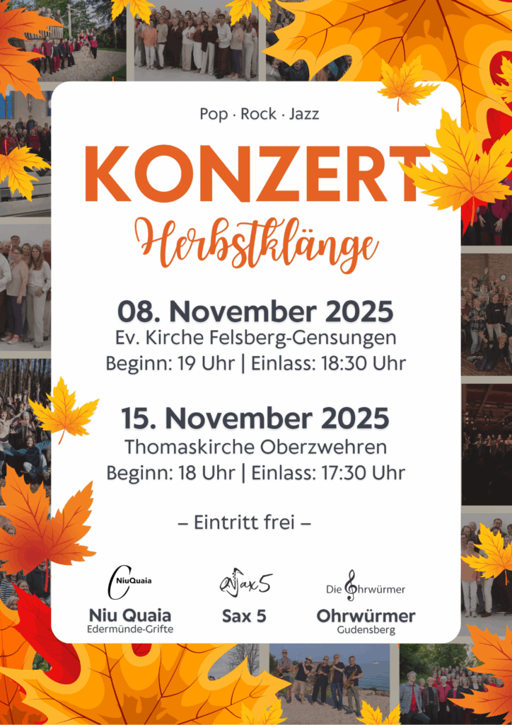 Am 08.11 und 15.11 präsentieren die Ohrwürmer und der Niu Quaia gemeinsam mit dem Saxophon Quintett Sax 5 wieder ihre musikalische Vielfalt bei zwei gemeinsamen Konzerten. Freut euch auf spannende Programme, stimmungsvolle Momente und jede Menge Chorgemeinschaft – ein Highlight für alle Musikliebhaber!